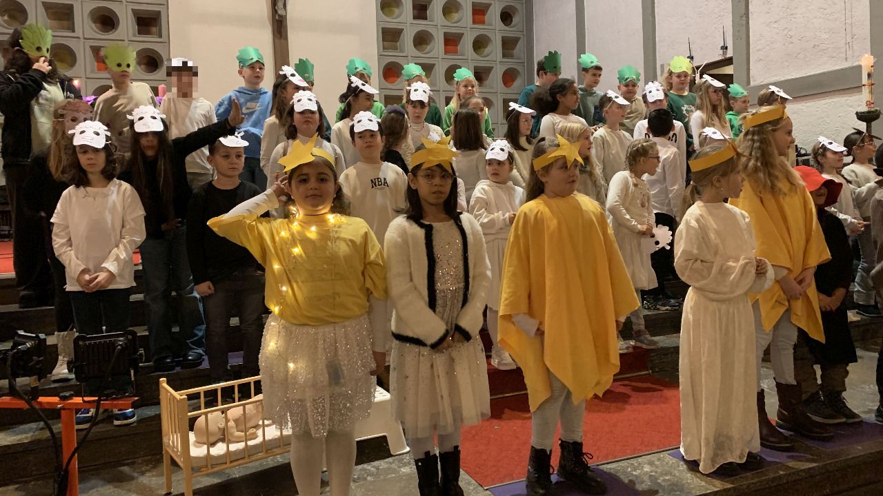Bei unserer Weihnachtsfeier in der Marienkirche am 12. Dezember erstrahlte nicht nur „der neue Stern“, der in unserem Weihnachtsstück plötzlich bei den anderen Sternen auftauchte. Frau Wagner hatte zum letzten Mal ein wunderschönes Theaterstück mit unseren Kindern einstudiert, in dem natürlich auch Maria, Josef, einige Sterne und die Hirten nicht fehlen durften. Der Chor war selbstverständlich mit von der Partie und ergänzte als Schafherde und Bäume das Bühnenbild.